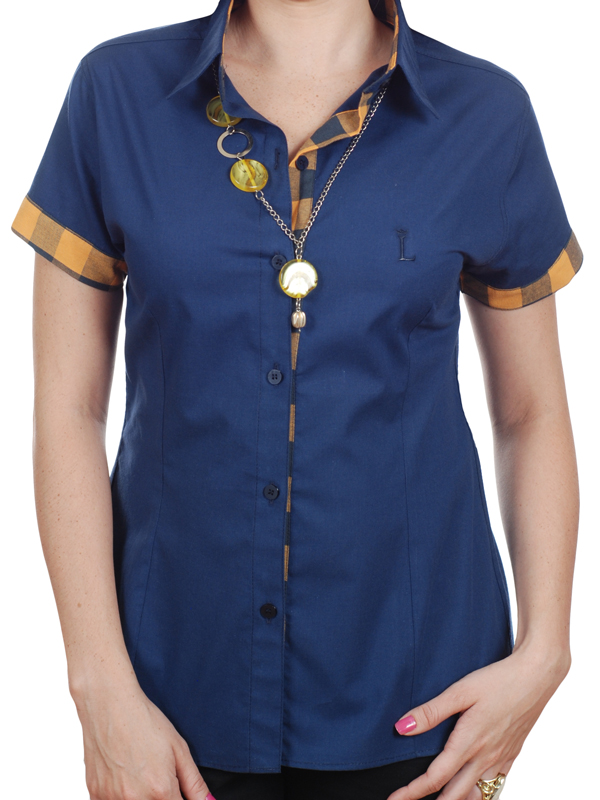 Camisa feminina de algodão puro em marinho com detalhe xadrez mostarda