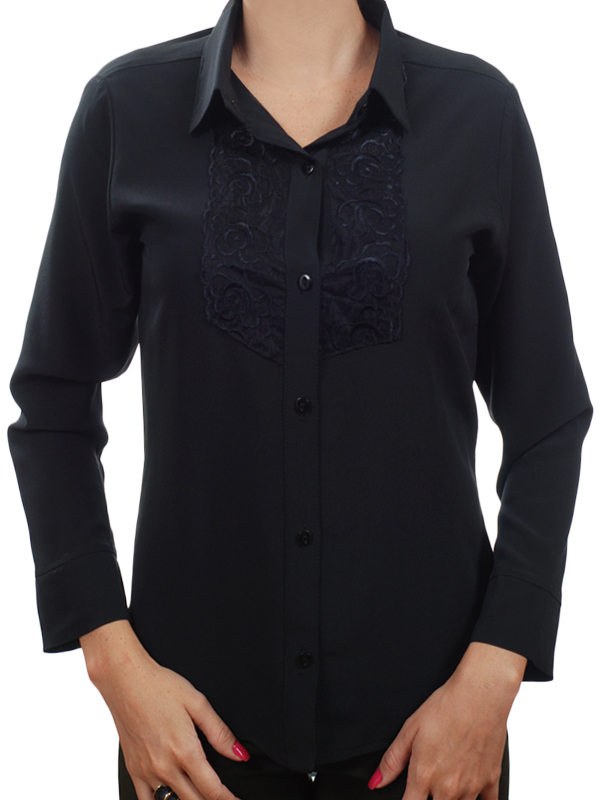 Quer combinação melhor? O clássico e ao mesmo tempo moderno, tecido de crepe, na cor preta, a cor mais elegante. O preto é ideal para qualquer combinação, tanto clássica, quanto a mais moderna. E nesta camisa, com detalhes na região frontal, o preto fica com um charme a mais.