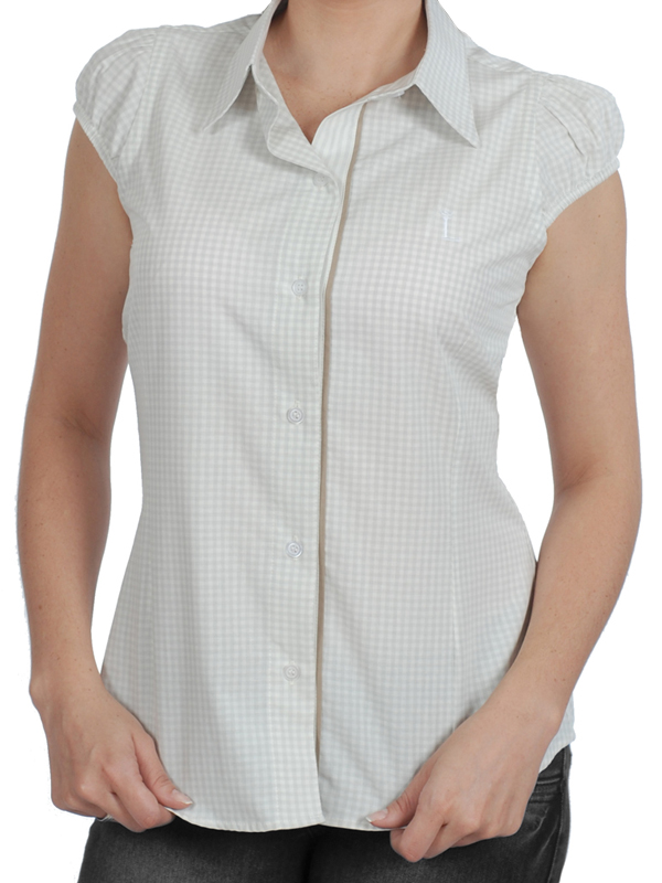 Home » Camisa Feminina » Manga Curta » Camisa social feminina xadrez branca com detalhe palha